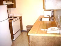 Two Bedroom Family Suite: A two bedroom family suite has two queen beds. The suite has two rooms, with one bed in each room. The suite also includes a full sized kitchen with a full size refrigerator, microwave, oven, stove, dishwasher, countertops, kitchen sink, and dishes. The suite has a table with chairs and large closets. Two bedroom family suites are available in both non-smoking and smoking.